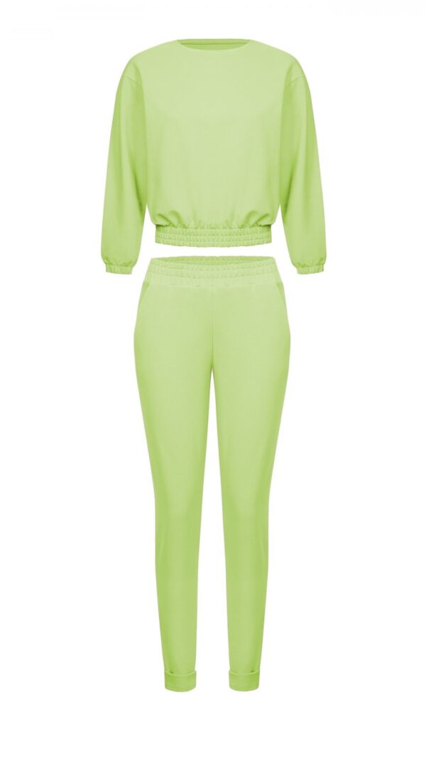 Do tego spodnie typu slim z wysoką talią oraz bocznymi kieszeniami, a dla komfortu noszenia – w pasie elastyczna szeroka guma. U dołu nogawek wysokie ściągacze.